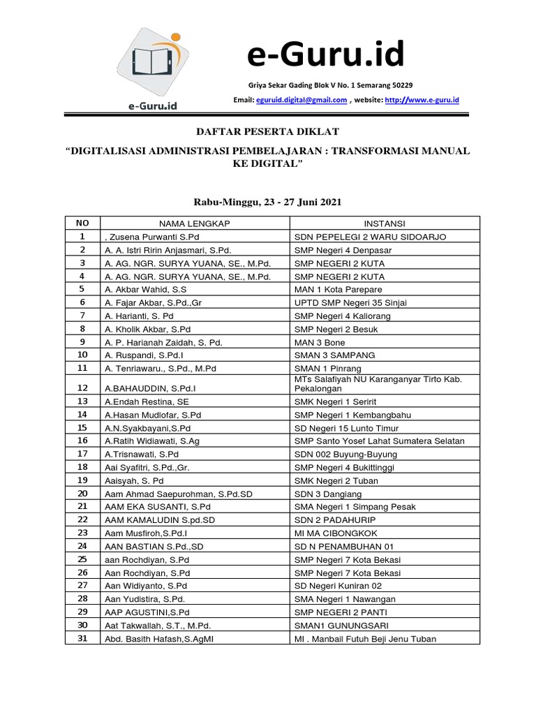 Daftar Peserta Diklat Digitalisasi Administrasi Pembelajaran Special Anniv Ke 2 E Guru Id Pdf