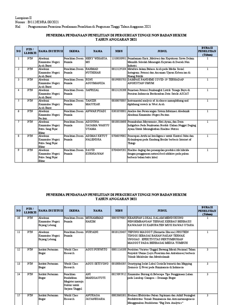 Lampiran Ii Penerima Pendanaan Penelitian Di Perguran Tinggi Non Badan Hukum Tahun Anggaran 2021 Pdf